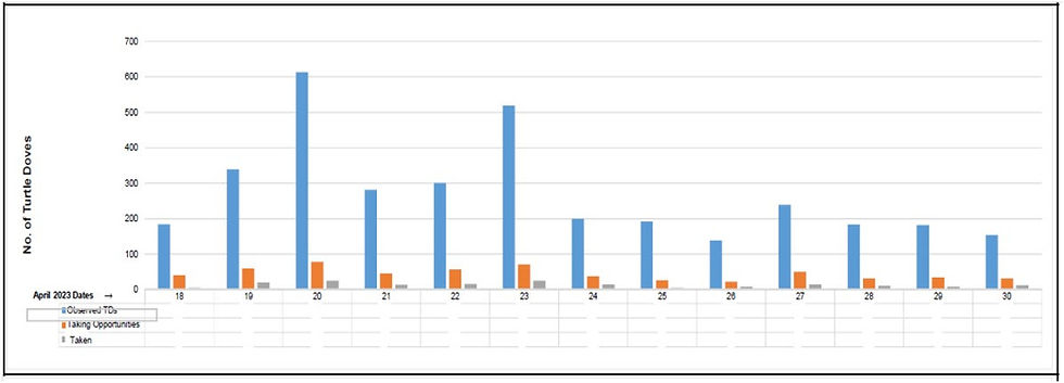 That the two peaks of observed turtle doves of 20 and 23 April 2023, also correspond with the peaks on the third graph which has been published by ECOSERV Ltd., a private Company that is commissioned by the Maltese Government to monitor and report about birds’ migration over the Maltese islands, in particular just before, during and for a short period after a hunting and/or trapping open season.